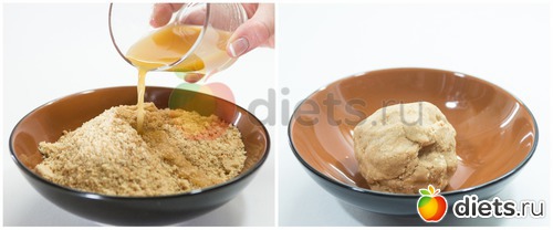 2. Выливаем в миску 60мл яблочного сока (можно взять покупной сок, но лучше, чтобы он был без сахара) и руками тщательно вымешиваем измельченное печенье с соком, как тесто.