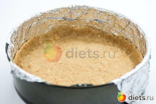 3. Разъемную форму диаметром 20см застилаем фольгой или пергаментом, выкладываем наше песочное «тесто» на дно формы и формируем невысокие бортики. Убираем в холодильник на 30 минут.