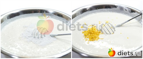 5. Перетираем все вместе до жидкой однородной массы (это очень легко сделать с помощью погружного блендера), добавляем 2 столовые ложки крахмала, тщательно перемешиваем. После этого кладем в начинку цедру. Цедры лучше добавить побольше, примерно 1-1,5 столовые ложки, также её можно заменить и апельсиновой. Снова все перемешиваем. Начинка готова.