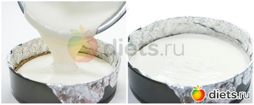 6. Достаем форму из холодильника и выливаем в неё творожную начинку. Ставим запекаться в заранее разогретую до 170 градусов духовку. При этом обязательно на нижний уровень духовки установите поднос с водой – чтобы творожный слой не потрескался. Либо приготовьте чизкейк на водяной бане. Готовить чизкейк необходимо около 60-70 минут. После чего духовку нужно выключить, а чизкейк оставить внутри остывать.
