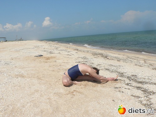 Не меняя положения ног, всем корпусом и прямыми руками потянитесь вперед. Зафиксируйте положение на 30 секунд.