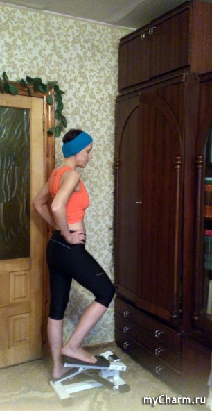 Раз в неделю, обычно это выходной день, делаю полноценную тренировку 40-45 минут. Упражнения с гантелями для бицепсов и трицепсов, ходьба на степпере для укрепления ягодиц и бедер, приседания, планка, отжимания.
