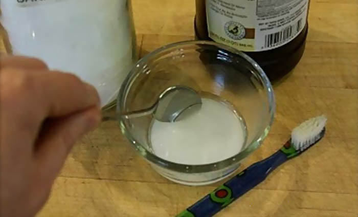 Смешиваем два ингредиента до получения кашицы. Нанесим смесь на ногти и оставляем примерно на три минуты. Моем руки тёплой водой.