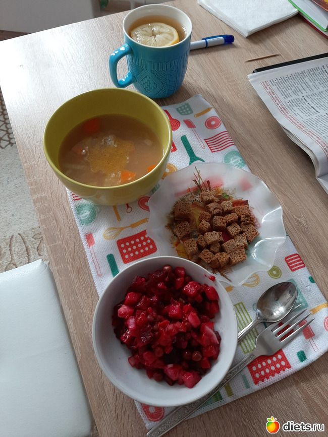 Обед - от супа горохового практически бульон остался, но с сухариками на ура пошёл))) И винегрет)) Кстати, суп ела чайной ложкой))) А что - прикольно