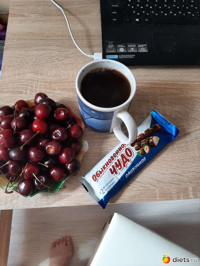 На перекус доела черешню. Хотела кофейку попить с шоколадной вафелькой - и тут как раз облом - она хоть и в хлебнице лежала, но... растаяла... Даже обёртка не снялась. Я обиделась. отправила её в холодильник и успокоилась мороженым
