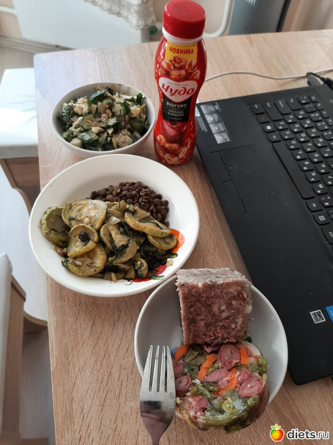 Ну, а у меня полные доедалки: чечевица, кабачки с зеленью, салат из икры минтая и овощей. Ура!!! Съедены!!!