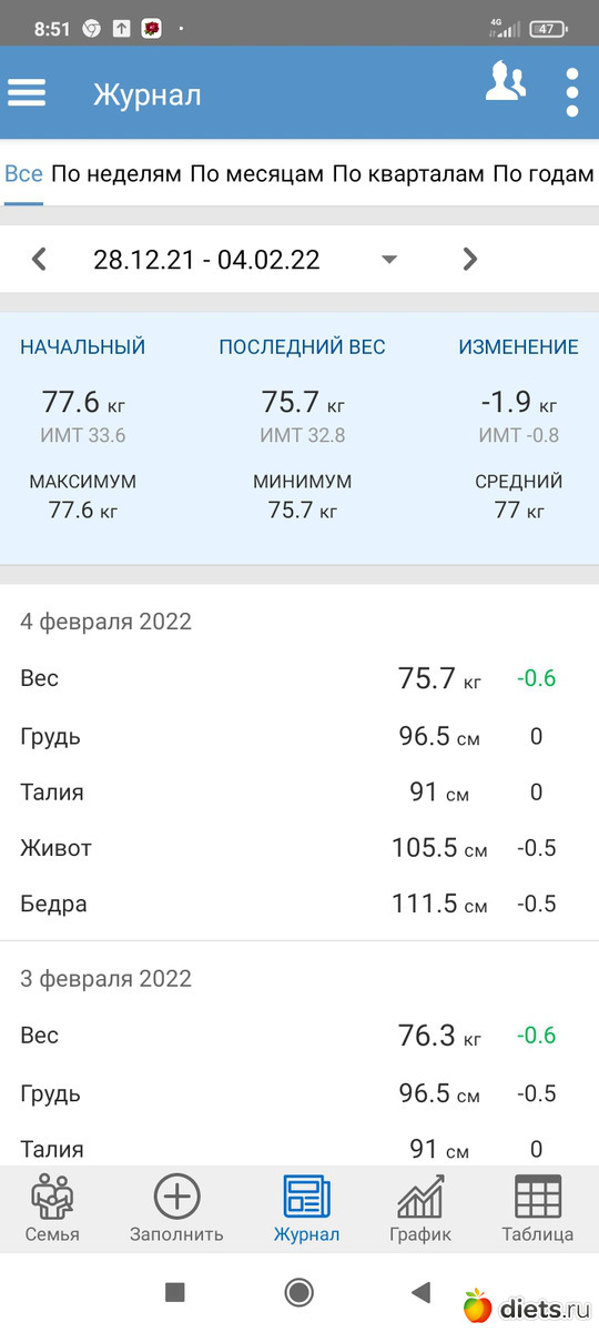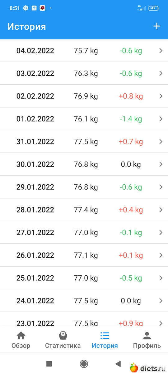 . Во-первых перешагнул отметку 76+ и во-вторых 2 дня подряд с большим отвесом. Такого у меня пока еще не было. Надеюсь завтра на новый отвес. Решила, что наконец-то "плато" прошло и снова стала пить Янтарку.