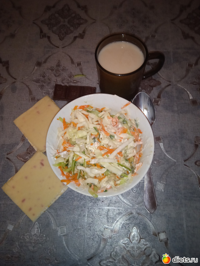 Салат. Белокочанная капуста, огурец, морковь, натуральный йогурт и чеснок. 117 гр. Кстати уже давно заметила. Все порции всегда до 117 гр, - большене ем.. Тарелка остается не доеденной. Надо посчитать размер желудка, - если конечно найду такую формулу.