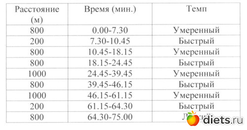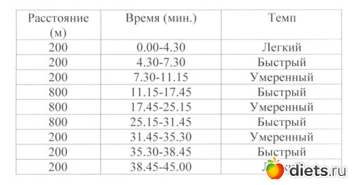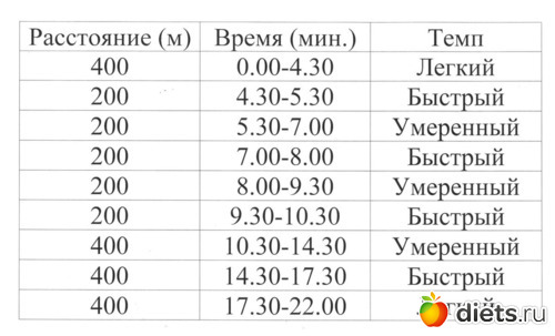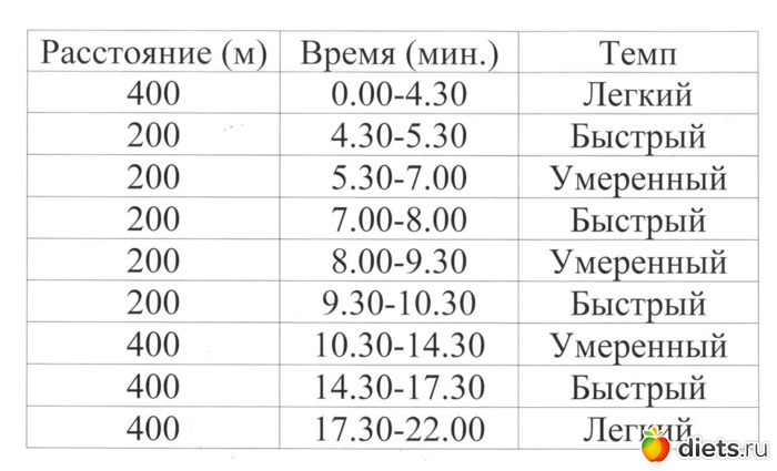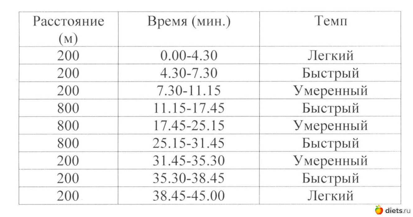 Смотрим по отрезкам. Быстрый темп -200м за 1минуту. Скорость -12км/ч . Это не переход на легкий бег, это такой себе нормальный бег, не спринтерский, конечно, но быстрый. Для умеренного отрезка скорость 9км/ч. То есть, вся тренировка 1 - это никакая не ходьба, по сути, а бег.