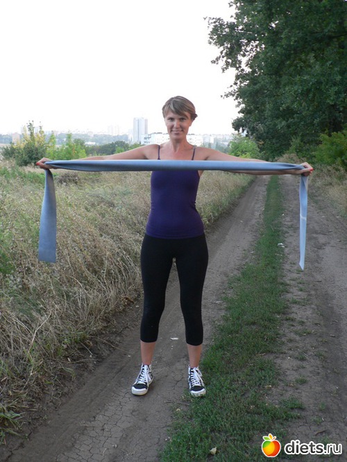 Из описанного исходного положения, преодолевая сопротивление резинки, разводим прямые руки в стороны. Возвращаемся в исходное положение.