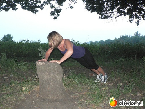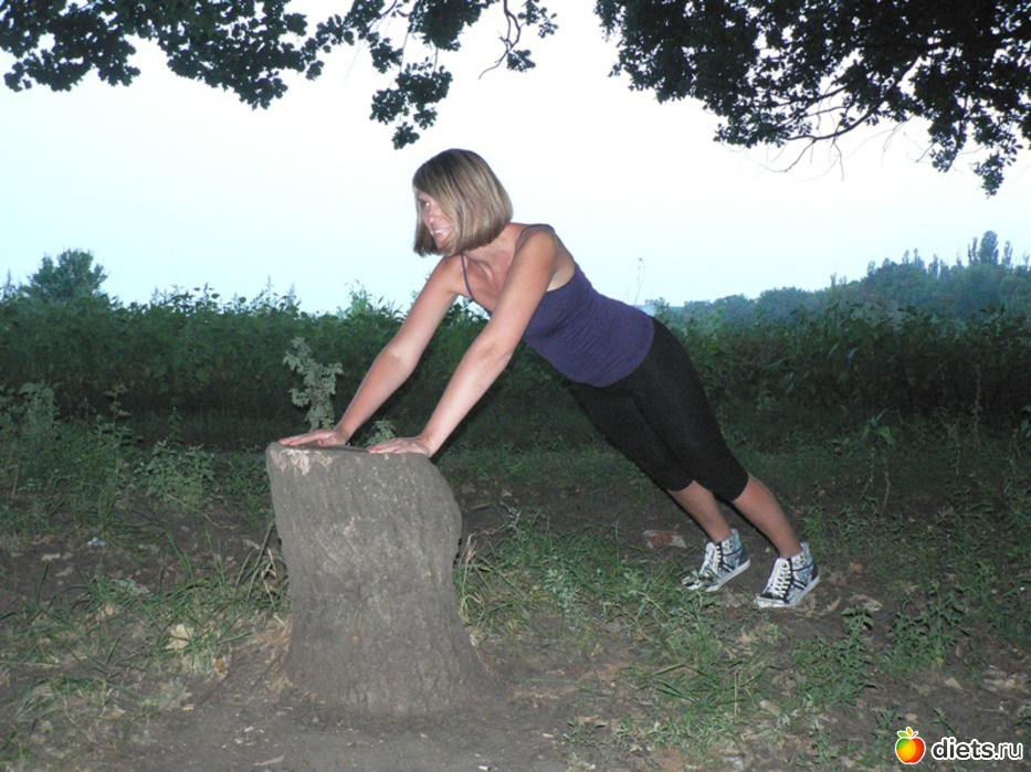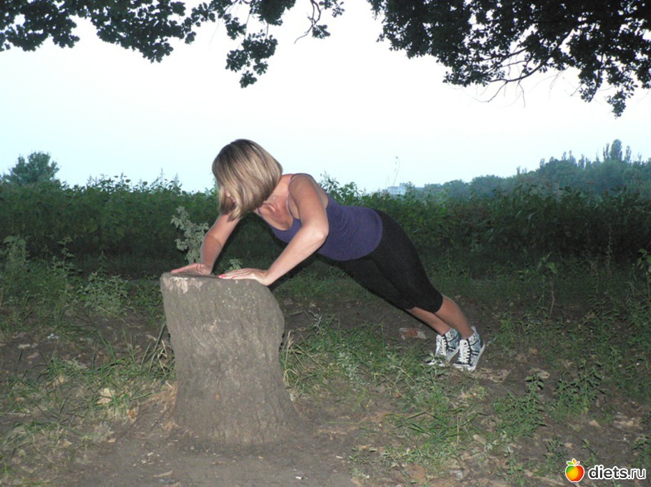 Исходное положение: упор руками на невысокую планку (лавочка, забор, бревно). Руки на ширине плеч. Корпус выведен в одну прямую линию с ногами, живот и ягодицы втянуты.