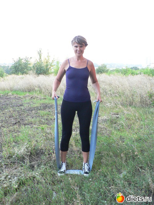 Исходное положение: стоя, ноги на ширине плеч, эспандер пропущен под стопами, а его края удерживаем ладонями.