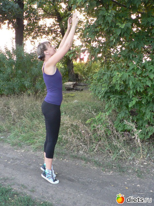 Из описанного положения выполняем резкий прыжок вверх, максимально потянувшись, словно стараемся достать высоко висящее яблоко. В момент приземления слегка повернитесь в сторону, имитируя движение, словно кладете сорванное яблоко в корзину. Повторите прыжок с приземлением на другую сторону.