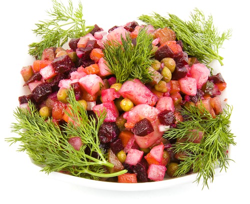 Необходимо нашинковать лук и грибы (маринованные или соленые), отваренную морковь, свеклу, огурец и картофель нарезать кубиками. Все перемешать, заправить маслом и уксусом. В этом блюде – 104 ккал.