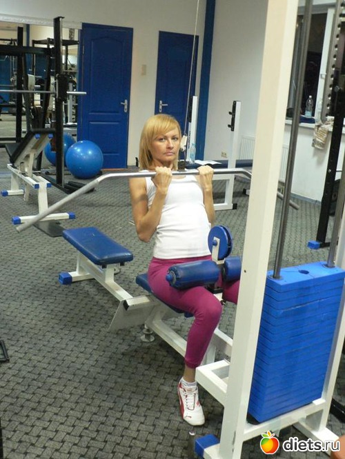 Продолжите тренировку на тренажере с верхним блоком. Сядьте на скамейку и зафиксируйте бедра под валиками. Возьмитесь за блок широким прямым хватом. Плавно, без рывков выполняйте тягу за голову. Вес при этом регулируйте в зависимости от уровня своей физической подготовки.