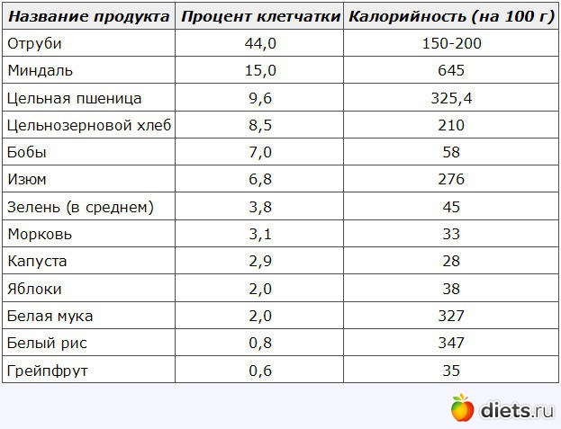 Примерное содержание клетчатки в некоторых продуктах и калорийность этих продуктов приведены ниже: