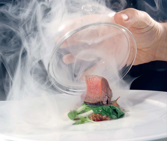 Еще один способ создать интересный эффект во время подачи молекулярного блюда – использование сухого льда, который по своей сути является замороженным углекислым газом. Если полить его специальной ароматной субстанцией, смешанной с водой, выделяется очень яркий запах, который подносит вкусовые ощущения на совершенно другой уровень. Ловкость рук и никакого мошенничества, но фокус получается очень эффектным.