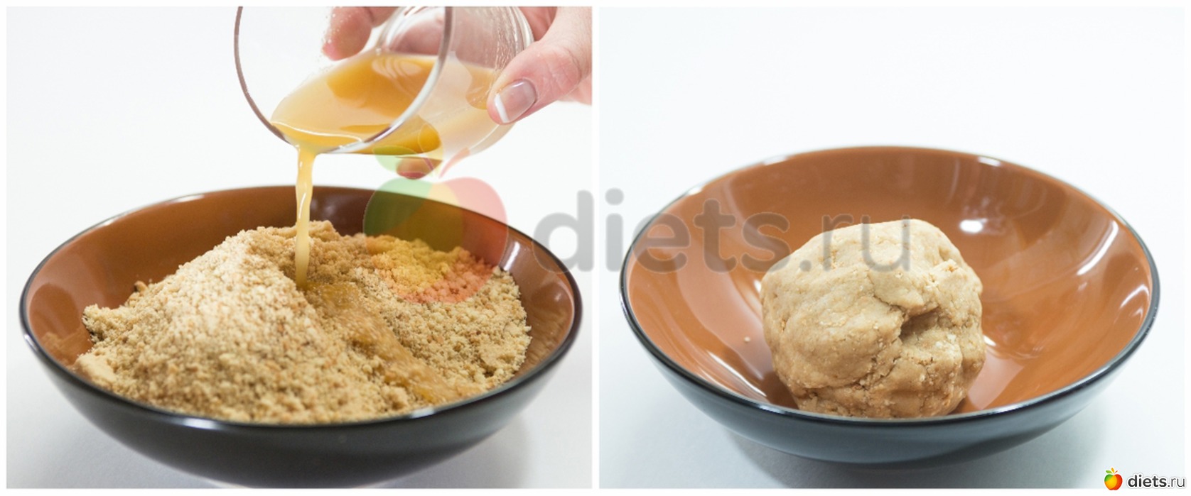 2. Выливаем в миску 60мл яблочного сока (можно взять покупной сок, но лучше, чтобы он был без сахара) и руками тщательно вымешиваем измельченное печенье с соком, как тесто.