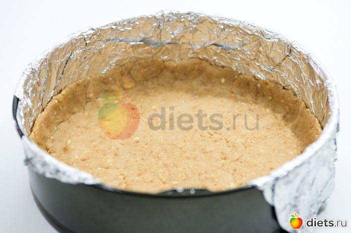 3. Разъемную форму диаметром 20см застилаем фольгой или пергаментом, выкладываем наше песочное «тесто» на дно формы и формируем невысокие бортики. Убираем в холодильник на 30 минут.