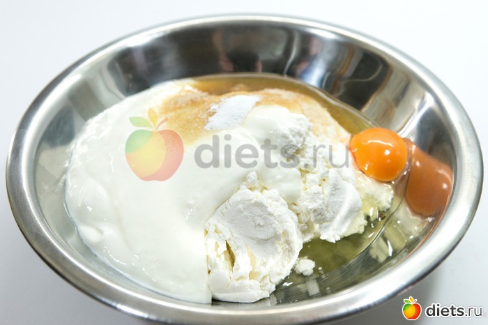 4. Тем временем приготовим начинку. Для этого смешиваем творог, йогурт, яйцо, сахар (для тех, кто любит послаще, можно добавить ещё немного сахара), ванилин и сок половины лимона в глубокой миске.