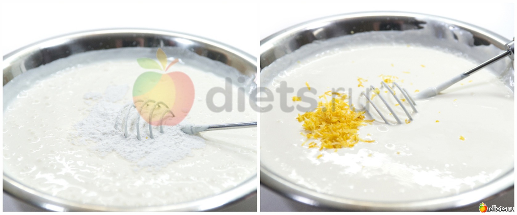 5. Перетираем все вместе до жидкой однородной массы (это очень легко сделать с помощью погружного блендера), добавляем 2 столовые ложки крахмала, тщательно перемешиваем. После этого кладем в начинку цедру. Цедры лучше добавить побольше, примерно 1-1,5 столовые ложки, также её можно заменить и апельсиновой. Снова все перемешиваем. Начинка готова.