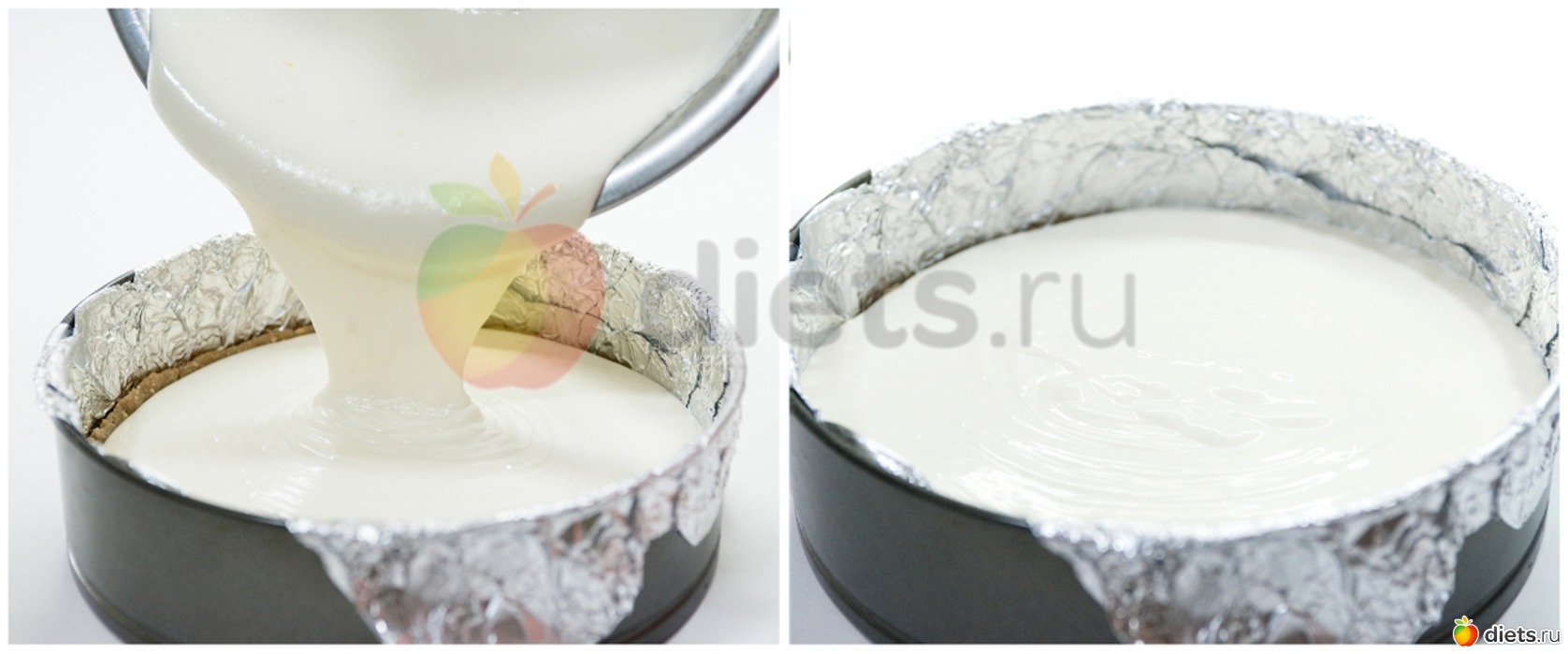 2. Чтобы чизкейк пропекся равномерно и не потрескался, его нужно готовить на водяной бане. Для этого форму с чизкейком оборачивают фольгой и ставят в форму большего диаметра, наполненную водой.