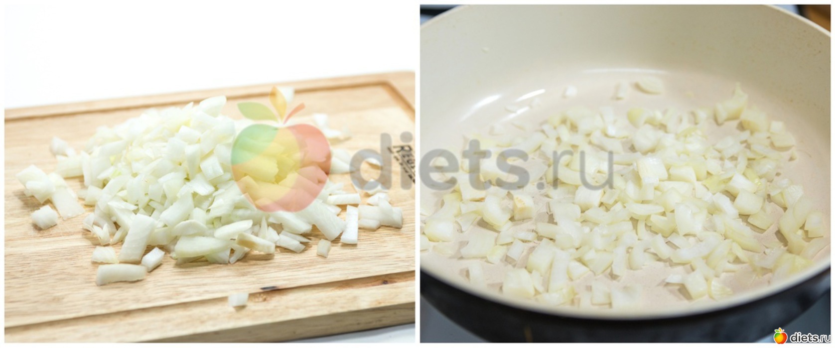 2. Репчатый лук чистим и мелко шинкуем. В сковороде разогреваем каплю растительного масла и обжариваем в нем лук до золотистого цвета.