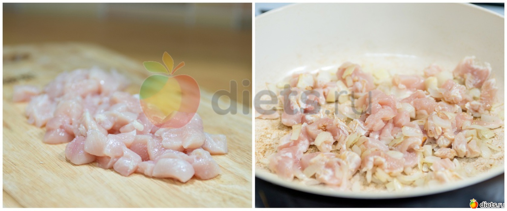 3. Куриную грудку промывам и обсушиваем, мелко нарезаем. Добавляем в сковороду к луку. Перемешиваем.