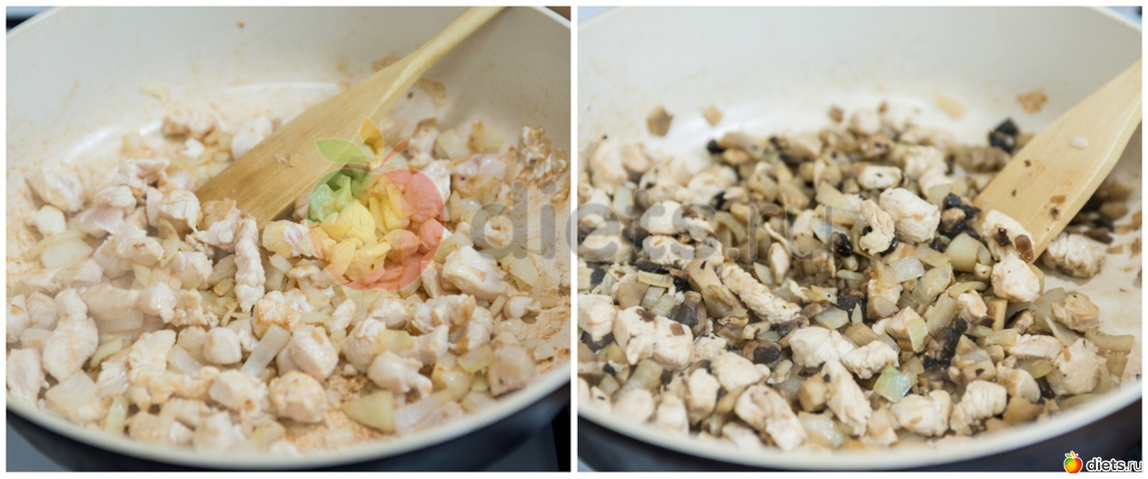 4. Слегка обжариваем куриную грудку, добавляем к ней измельченные ножки грибов и удаленную внутренность из шляпки. Перемешиваем и обжариваем до полуготовности. Солим по вкусу.