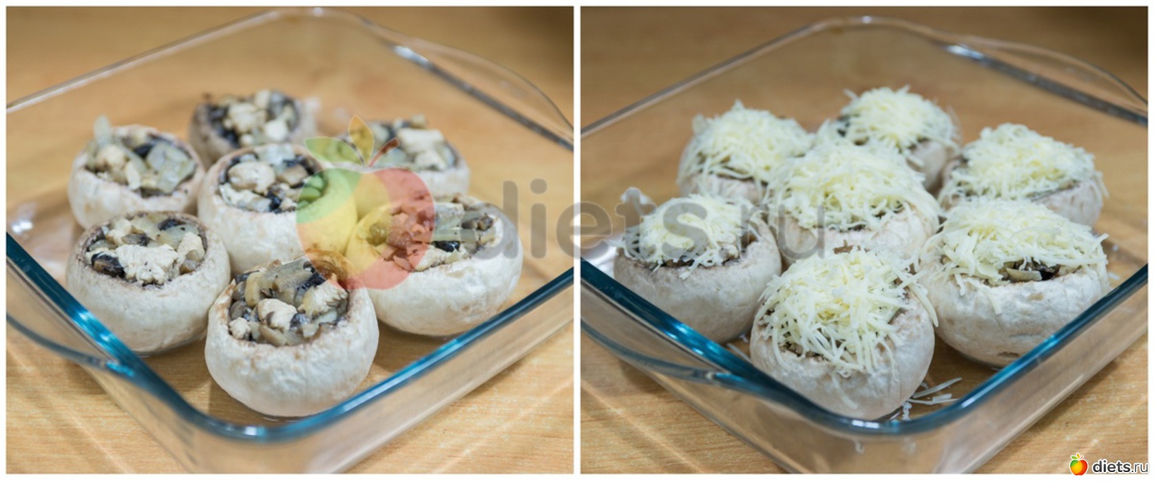 6. Фаршируем полученной массой шляпки шампиньонов и выкладываем их в форму для запекания (в форму заранее нужно налить немного воды, примерно 1 см от дна формы). Сверху на каждый гриб выкладываем по порции тертого сыра.