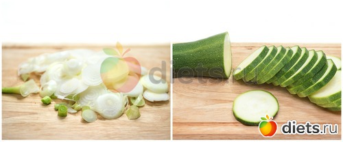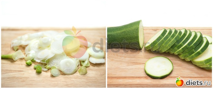 2. Тем временем репчатый лук очистить и нарезать кольцами, кабачок промыть, обсушить (если кожура твердая – очистить) и нарезать кружочками, толщиной примерно 1-1,5 см.