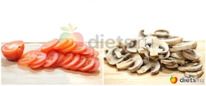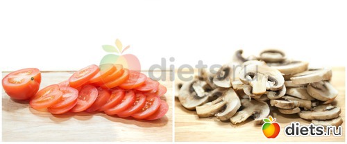 3. Помидор также промываем и нарезаем кружочками. Шампиньоны замачиваем ненадолго в воде, затем тщательно моем, обсушиваем и нарезаем тонкими ломтиками.