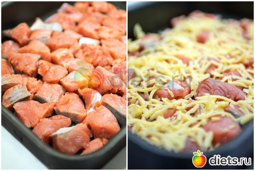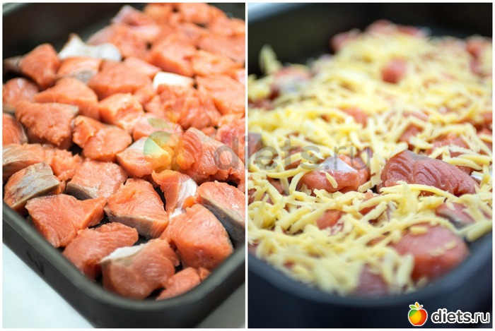 4. На дно формы первым слоем укладываем кусочки рыбы. Сверху слегка посыпаем тертым на крупной терке сыром.