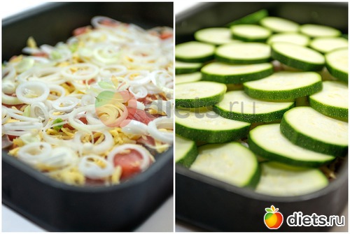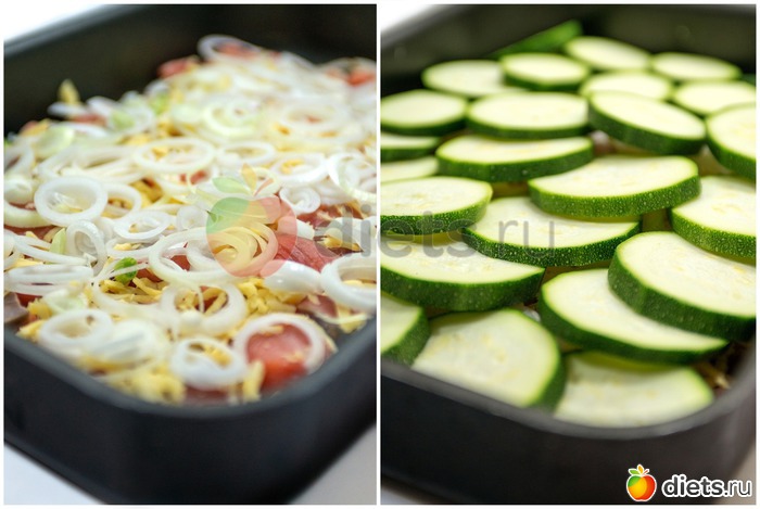 5. Далее выкладываем колечки лука, а сверху – кабачок. Выливаем стакан воды.