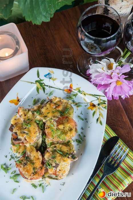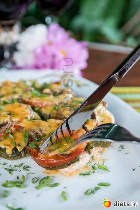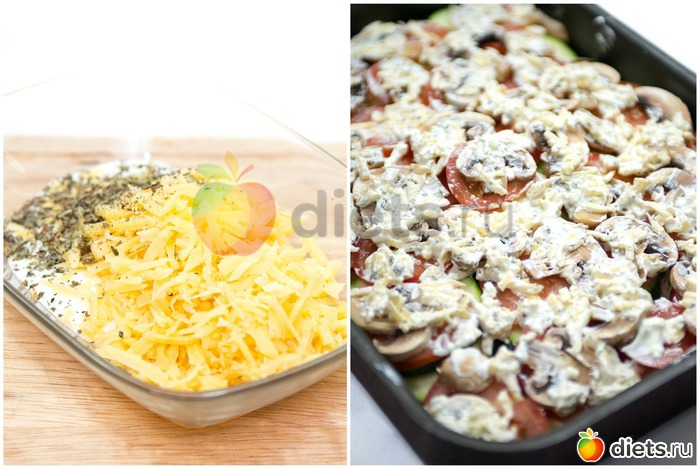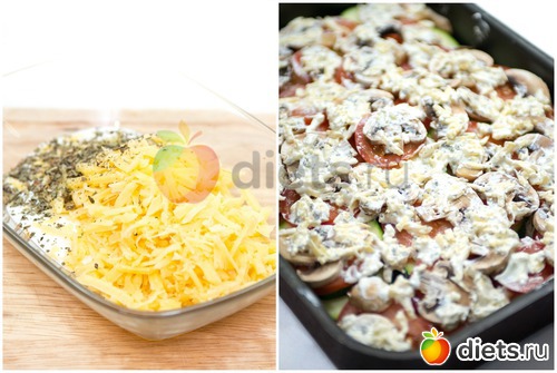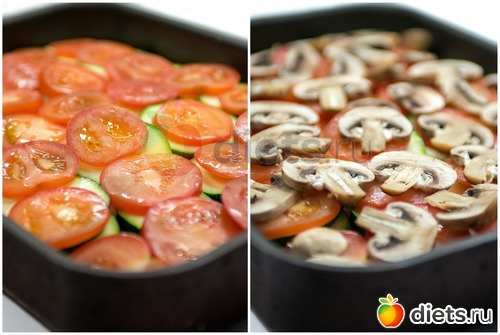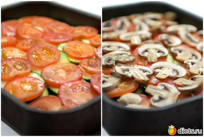 6. Следующим слоем, на кабачок кладем кружочки помидоров. Затем – шампиньоны.