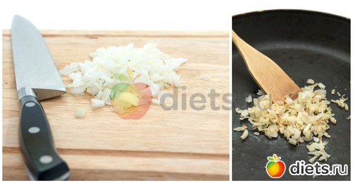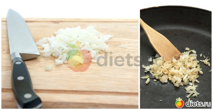 1. Лук чистим и мелко шинкуем. Сковороду разогреваем и обжариваем лук в капле оливкового масла до мягкости.