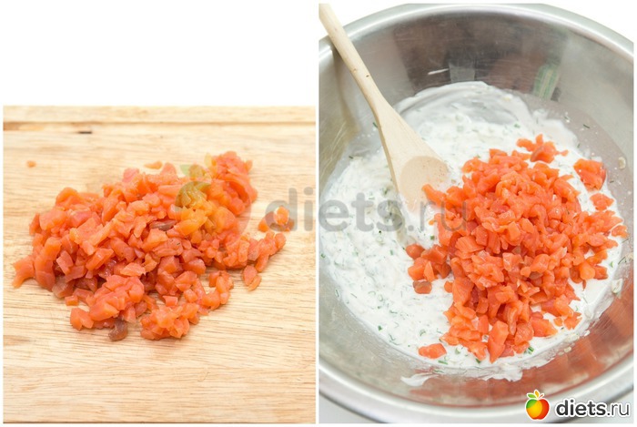 3. Копченый лосось чистим от шкурки и костей, нарезаем мелкими кубиками. Добавляем к сметано-творожной массе с зеленью. Перемешиваем.