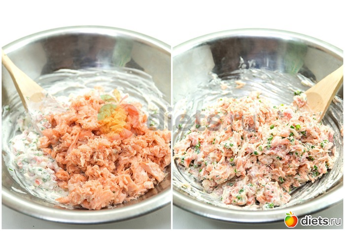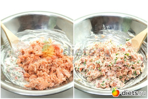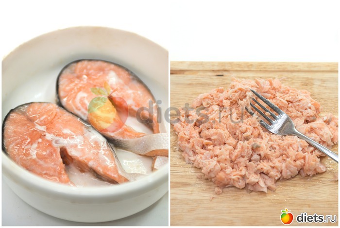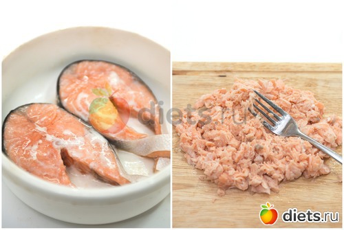 4. Стейки лосося (заранее приготовленные на пару) очищаем от костей и шкурки, измельчаем с помощью вилки.