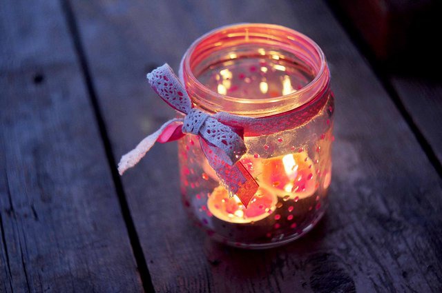 Для этого понадобятся: разноцветная папиросная бумага, ленты для декора, а также подберите оригинальные стеклянные банки (если после сезона заготовок хоть что-то осталось). Кроме того, для украшения будущих фонариков можно вырезать из черного картона устрашающих насекомых или прямо на бумаге нарисовать кривые рожицы. Обматываем банки бумагой, у горлышка фиксируем лентами, декорируем различными фигурками, а внутри зажигаем свечки. Пора на шабаш!