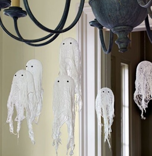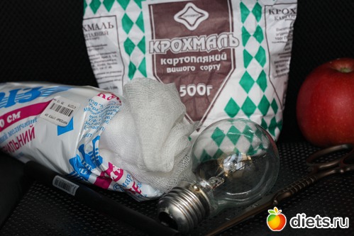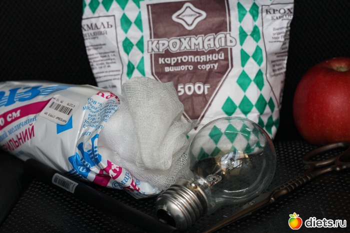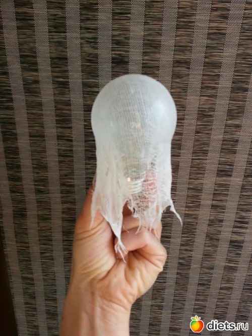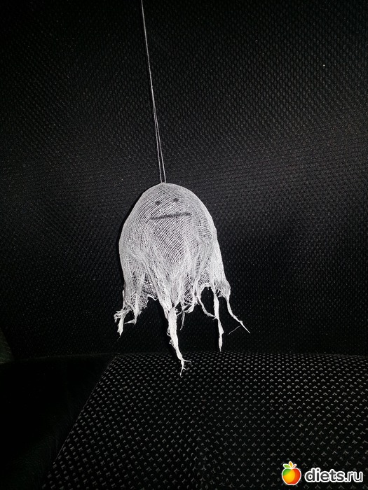 Завариваем крахмал (желатин или разбавляем клей ПВА), вырезаем из марли будущее привидение. Замачиваем марлю в полученном составе и натягиваем на лампочку или что-нибудь шарообразное.