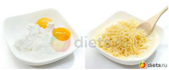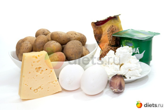 1. Картофель очистить и поставить вариться в подсоленной воде. Тем временем приготовим сырный крем. Для этого необходимо отделить белки от желтков, желтки растереть с творогом и натуральным йогуртом (или сметаной), приправить солью, мускатным орехом и молотым черным перцем по вкусу, перемешать. Сыр натереть на крупной терке и добавить к творожной массе. Хорошо перемешать.