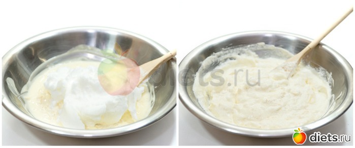2. Белки взбить со щепоткой соли в густую пену и аккуратно ввести в творожно-сырную смесь, неспешно перемешивая деревянной лопаточкой снизу вверх.