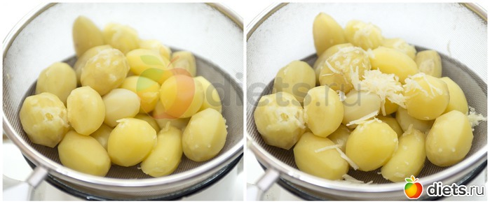 3. С готового картофеля слить воду, добавить к нему выдавленный (или натертый на мелкой терке) чеснок и аккуратно перемешать.
