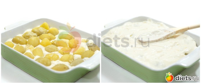4. Духовку разогреть до 200 градусов. В форму выложить половину крема, затем картофель, и поверх картофеля снова аккуратно распределить оставшийся сырный крем.