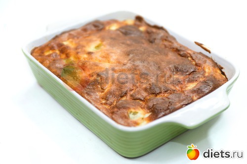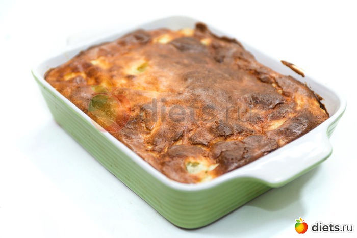 В 100 граммах готовой запеканки содержится 159 ккал: белки 10 г, жиры 7 г, углеводы 14 г.