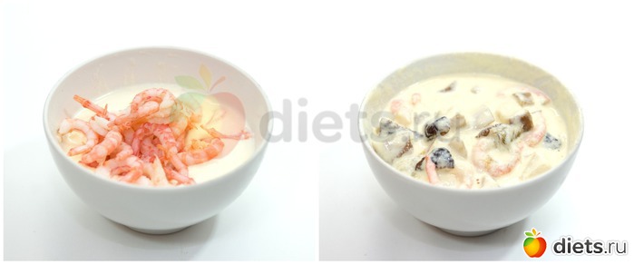 3. Подготовленные креветки и грибы смешиваем с соусом.