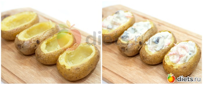 4. У запеченного картофеля аккуратно срезаем верхушки и осторожно удаляем сердцевину. Немного присаливаем внутреннюю часть. Наполняем картофель полученной массой.