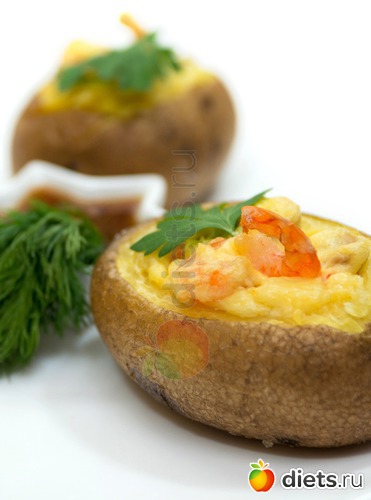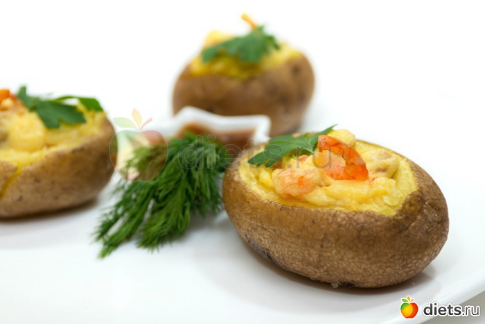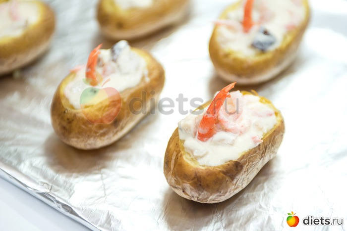 5. Заранее отваренными и очищенными королевскими креветками украшаем картофель с начинкой и ставим их в духовку запекаться до образования румяной корочки.