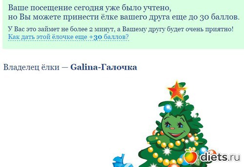 Для роста елочки нужно, что Ваши друзья заходили на эту страничку. Их приход подбадривает елочку, и она быстро растет, помогая желаниям сбыться.