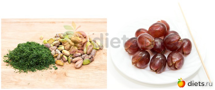 1. Укроп заранее промыть и тщательно обсушить (чем суше будет укроп, тем легче в нем будет обкатывать шарики), мелко-мелко нарезать, фисташки очистить. Виноград промыть, обсушить, надрезать на 4 части и аккуратно, с помощью зубочистки или шпажки, удалить косточки.